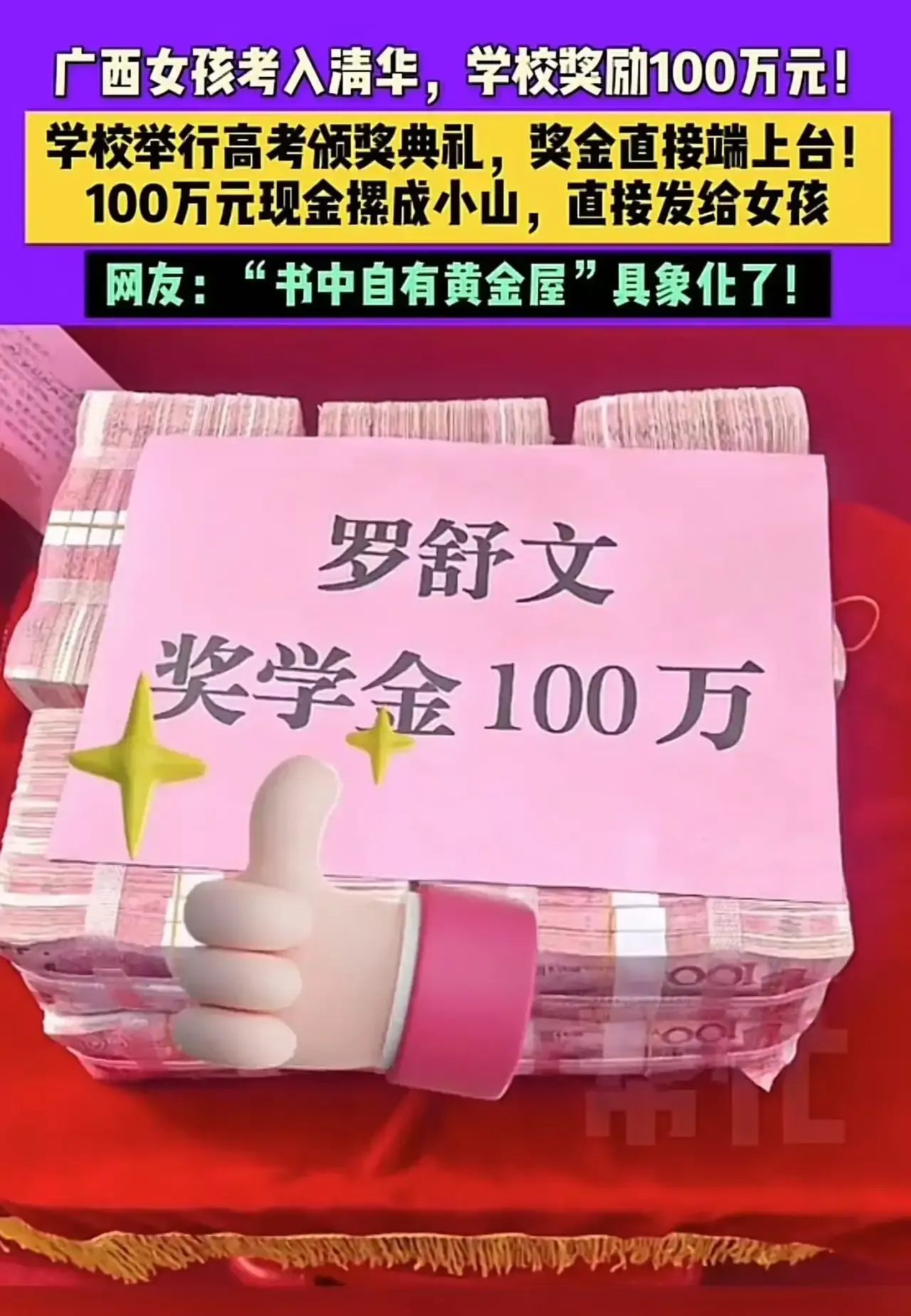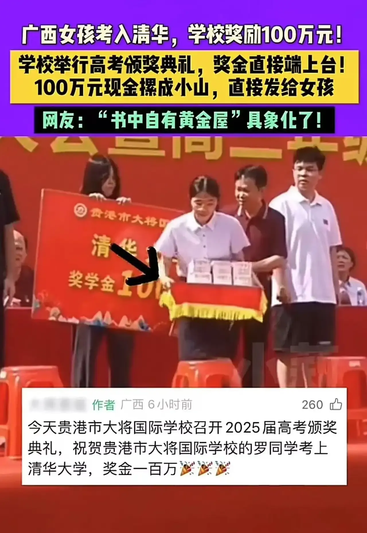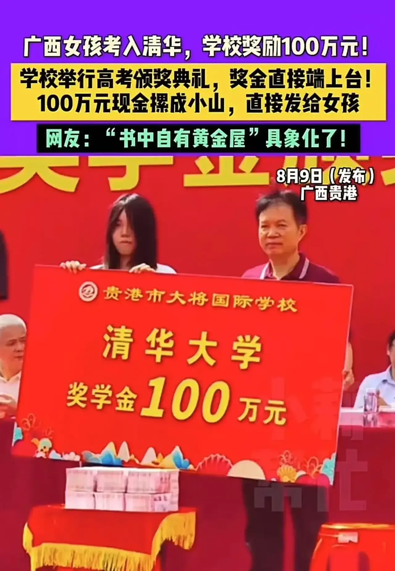 “原来书中真的有黄金屋!”广西贵港icon,女孩考入清华大学,学校奖励1000000现金!拍摄者:100万现金堆成小山,直接发给女孩!网友:100万做个广告,今年有实力的尖子生就闻风而动去这个学校了,学校领导实在高明!